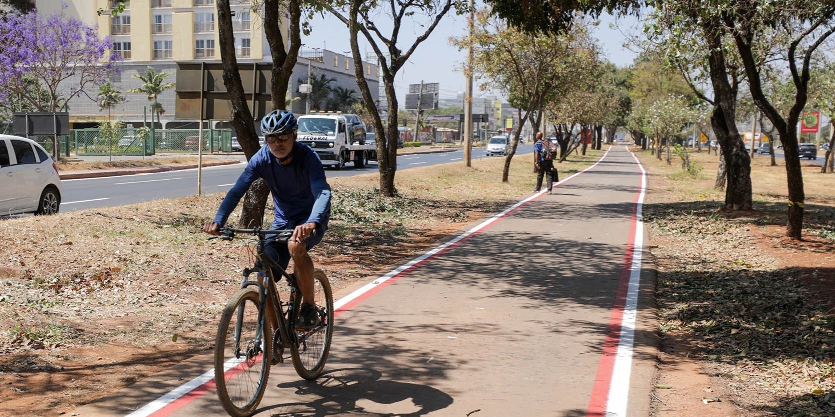 A dona de casa Jociene Dormelas, 42, também passa pela ciclovia quase todos os dias para levar almoço para o marido, que trabalha em uma instituição de ensino na região. Ela reforça que a passagem com travessias sinalizadas facilita muito o trajeto. “É bom porque a gente não corre o risco de estar andando na beira da pista, que é muito perigoso. E nesse calor acaba tendo uma sombra, por causa das árvores, realmente gostei muito”.
