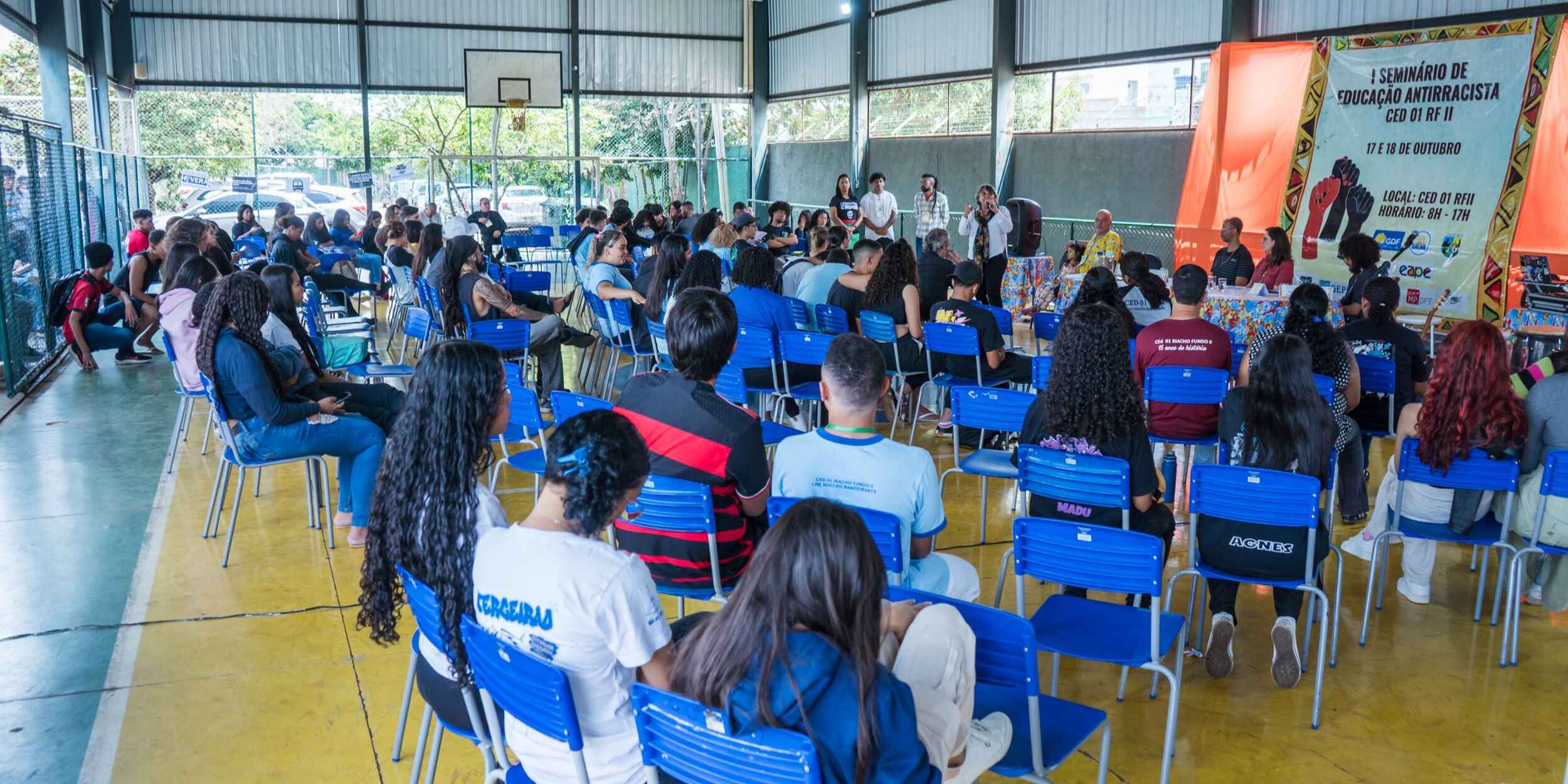 O Centro Educacional (CED) 01 do Riacho Fundo II iniciou, nesta quinta-feira (17), o 1º Seminário de Educação Antirracista da escola. O evento tem por objetivo promover ações e práticas de combate ao racismo no cotidiano escolar e na comunidade. Até sexta-feira (18), os estudantes participarão de diversas atividades, com saraus de cultura de paz, oficinas e debates sobre as temáticas com palestrantes convidados.