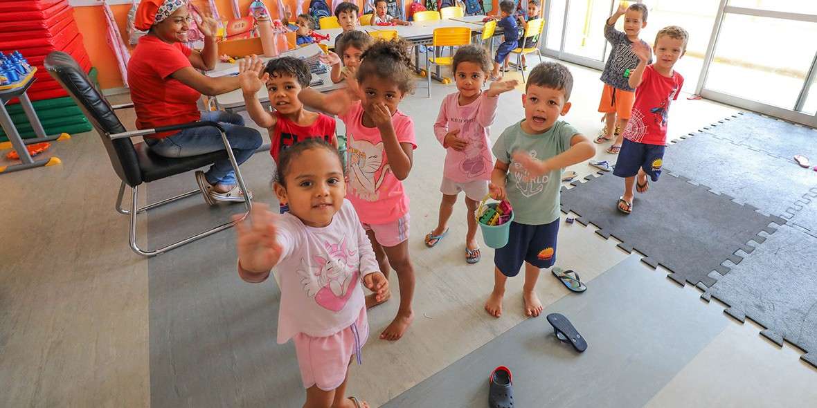 Segundo ela, o desenvolvimento infantil é estimulado principalmente por atividades lúdicas. “As nossas crianças aprendem brincando, com musicalização e rodinhas. A gente percebe cada vez mais o avanço delas por meio do lúdico”, diz.