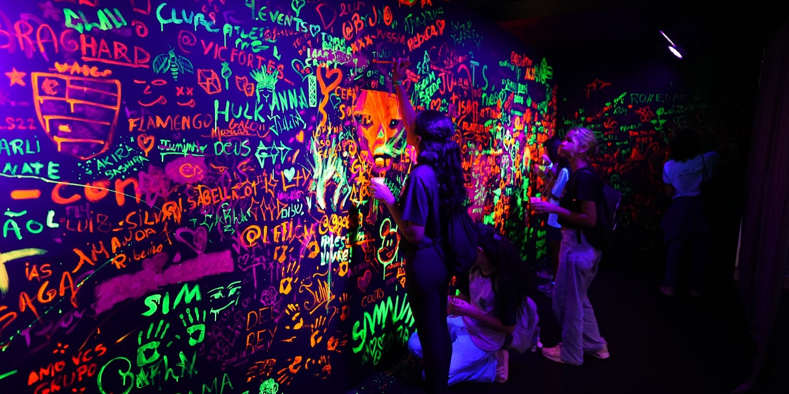 • Neon Space, espaço onde os visitantes poderão desenhar, escrever e pintar usando tintas fluorescentes que em ambiente com luz negra, deixa o espaço super instagramável. O artista e professor de ilustração, que também estuda e aplica em seu trabalho essa técnica utilizada no espaço vai ensinar como fazer.