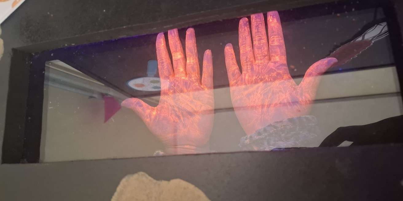 Após a primeira aplicação da tinta, os profissionais repetiram o processo, seguindo o passo a passo recomendado pela Agência Nacional de Vigilância Sanitária (Anvisa). Por fim, voltavam à caixa com luz negra para verificar se ainda havia resíduos, confirmando se a limpeza estava completa.